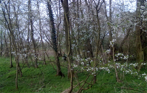 Wild cherry blossom in blossom at Whitwell Common; most of the greenery beneath the trees is dog’s mercury