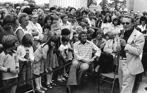 Comedian and entertainer Dickie Henderson is pictured with the microphone, with Ken Ewing, a town councillor for many years and chairman of the tennis club, seated in the cordoned-off area. It is thought Ben Stimpson is seated in the middle right of the picture.