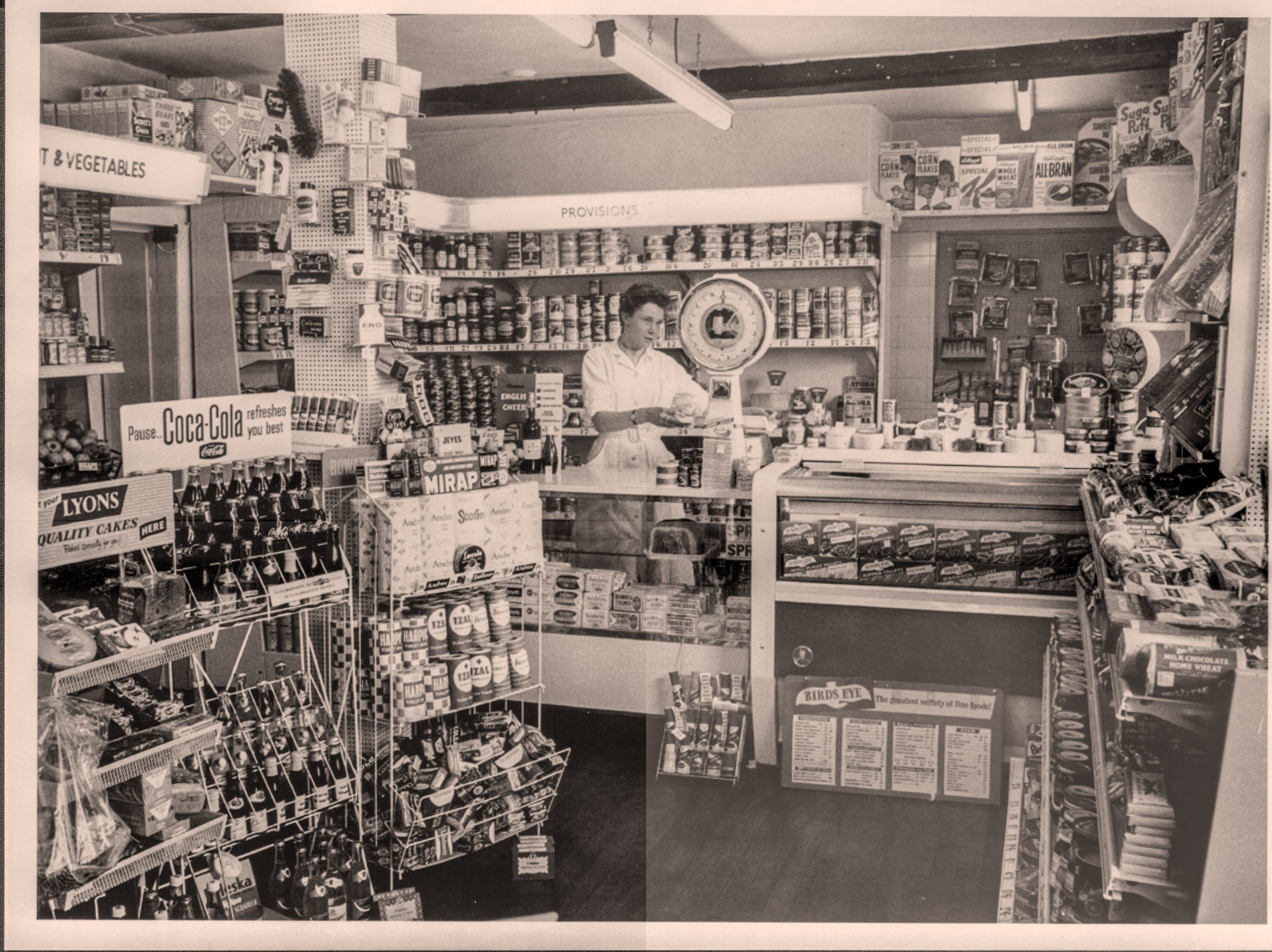 Although there was counter service for goods such as cheese and bacon, the interior shows a variety of goods on display, available for customers to pick up themselves: the beginnings of self-service.