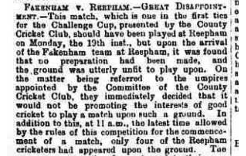 Finding a suitable match ground seems to have been a perennial problem. In 1884, when the cricket club was again re-formed, the club resumed using a ground at Kerdiston, probably made available by Barnabas Seely. But misfortune lay ahead, hence th extract (above) from the Norwich Mercury in May 1884.