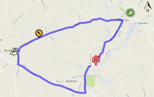 The alternative route is via: Whitwell Common, Whitwell Road, School Road, B1145 (Dereham Road/Bawdeswell Road/Reepham Road/Norwich Road), A1067 (Fakenham Road/Main Road/Sparham Hill), Nowhere Lane (Reepham/Bawdeswell/Great Witchingham/Sparham).