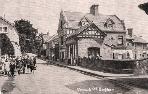 The first building on the right housed a harness maker, John Rooke: saddles and harnesses can be seen draped over the wall. He later moved to Cawston, but kept a shop on the other side of the road, which can be seen on the left in the picture below, taken later.