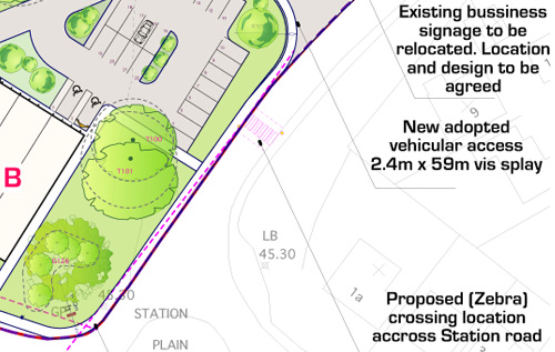 The proposed site plan (pictured above) approved by Broadland District Council clearly shows a zebra crossing across Cawston Road (incorrectly labelled “Station Road”).