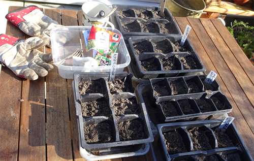 Seedlings are all in pots in trays to save water. I use recycled plastic supermarket trays, which, being rectangular, work well with square pots.