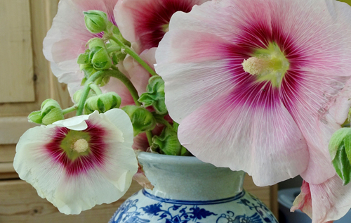 Above: These hollyhocks grew so tall and fell over, so I brought some in to enjoy indoors. Photo: Tina Sutton