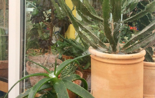 Pictured above: A Norfolk-bred aloe growing outside my conservatory this week, notice the ice and ladybird. (The other succulents are inside the conservatory.) Below: Another shot of the same plant. It has survived frosts before. Time will tell if it does again. Photos: Tina Sutton