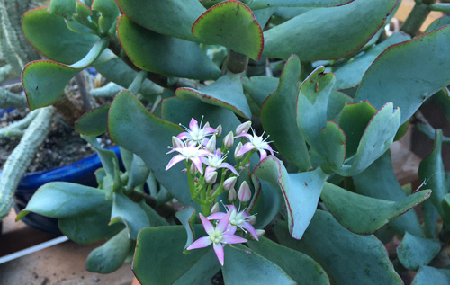 I have another Crassula (nameless), which has sent up long stems and also produced pretty flowers, and an Aloe with a great big flower bud getting ready to burst.