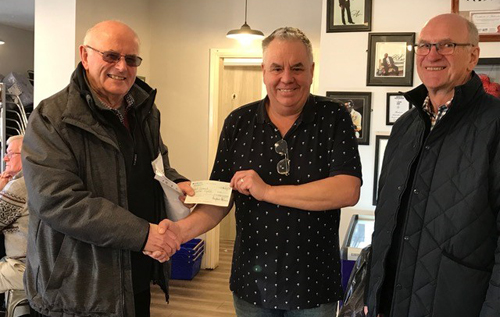 Above : Reepham Lions Barry Howes (left) and Kevin Long (right) handing a cheque to Rob Scammel (centre), who led the trip to Ukraine. Below: Left to right: Reepham Lions members Gill Long and Barry Howes presenting a cheque to the two members of staff at Scrapbox, Tula Chenery, manager, and Gina Bailey, assistant manager. Photo: Reepham Lions