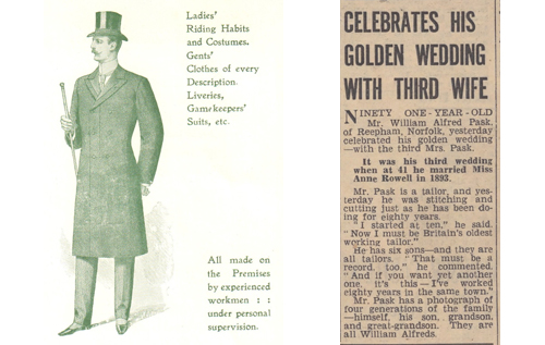 William, then age 91, was still a working tailor with branches of his business in Aylsham, Melton Constable and Lowestoft, all run by members of his family.