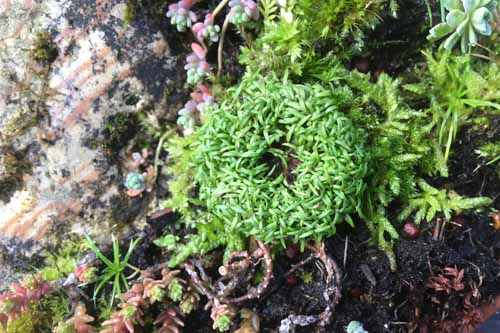 I noticed a fascinating ring of tiny seedlings in my miniature garden (below). You can see how small they are by the scale of the moss and the sedum leaves. This little garden lives in an undrained saucer, outdoors, with no fertilisation or soil change, so growth is never lush, in fact all the plants therein have a hard time.