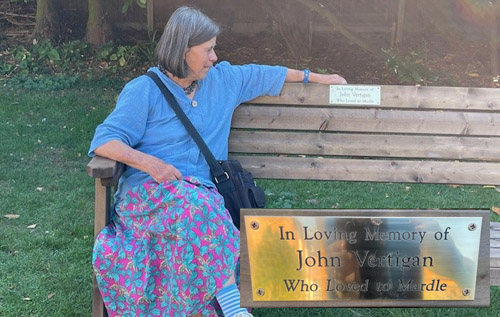 Liz Vertigan and the bench in the Bircham Centre Walled Garden dedicated to her late husband, John Vertigan, “who loved to mardle”. Photo: Reepham Lions