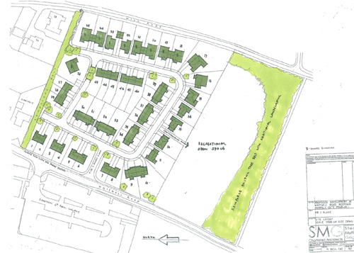 The outline scheme prepared by SMG Architects of Sheringham proposes the development of 45 dwellings on part of the site (2.1 hectares) with the remaining 1.7 hectares allocated for recreational open space and landscaping. (An earlier proposal had indicated 50 houses spread across the whole 3.8-hectare site.)