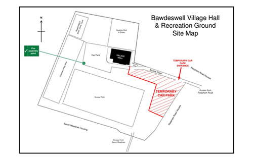 A temporary car parking area has been marked out on the playing field. Please drive carefully and slowly on the grass and take note of the signs. The entrance is on the left at the beginning of the playing field, while some spaces nearer to the hall are reserved for anyone with mobility issues.