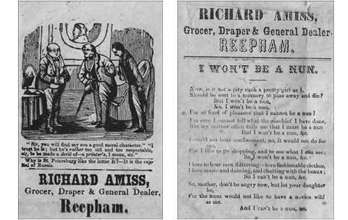 This is one of the riddles printed underneath a series of cartoons on a large sheet of paper with “Richard Amiss Grocer, Draper & General Dealer” and “Reepham” beneath each one.