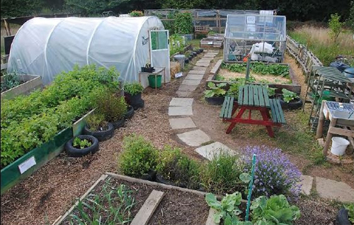 Almost every part of the allotment has been built using recycled materials, such as old school fire doors, wooden pallets, sinks and car tyres.