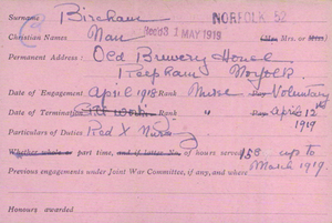 Each volunteer had a record card and the card of Nan Bircham (Samuel Bircham’s daughter-in-law) is shown below.