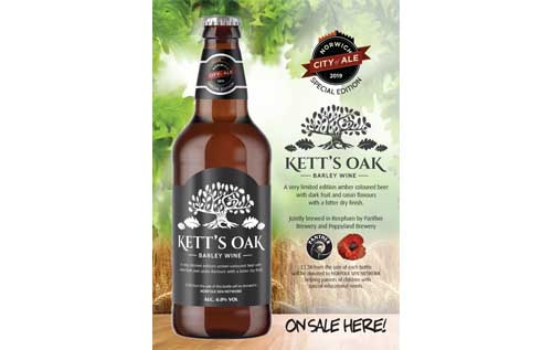 Martin James of Reepham’s Panther Brewery and Dave Cornell of Poppyland Brewery in Cromer brewed Kett’s Oak, a 6% barley wine style, for the Norwich City of Ale event in May 2019.