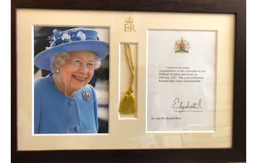 Thanks to June Betts’ nephew Roland Pickett, who lives in Peterborough, for providing this information and his wife for the photos of the happy couple and royal message.