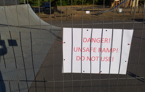 Following an inspection this week the skateboard ramp was judged to be unsafe. It was then cordoned off with red and white tape and safety notices put in place explaining the reason for the closure.