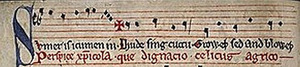 The opening line is shown here with the red cross indicating where the second voice is to enter. The manuscript is now kept in the British Library and includes instructions for its performance in Latin. It is traditionally sung from the tower of Magdalen College, Oxford, every May Day.