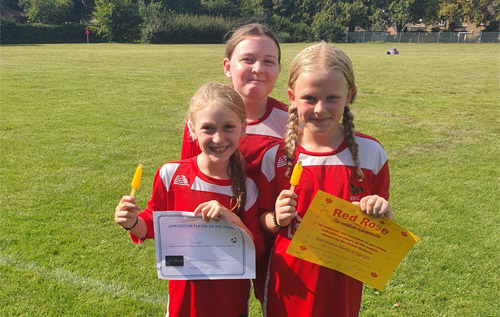 Above: Some of the Red Rose FC girls after their hottest match of the season. Below: Red Rose players Phoebe and Jessie with player of the match awards, with teammate Pixie at the rear. Photos: Red Rose FC