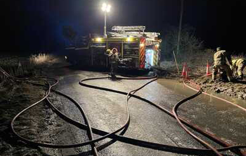 After consultation with Highways and local farmers, Reepham fire crew pumped out about 150,000 litres from the Norwich Road “puddle” near Eves Hill Farm, Booton, on Tuesday 9 January, enduring some very wet and cold conditions.