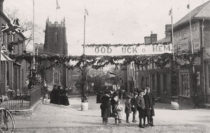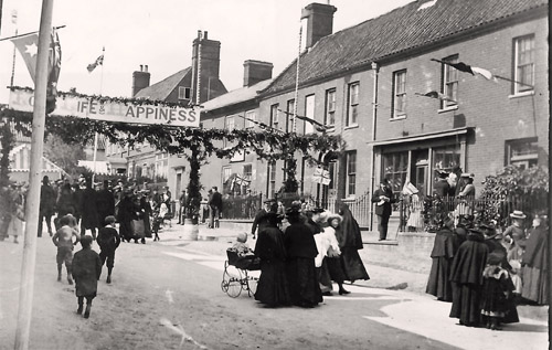 The town was decorated with flags and garlands, arches were erected in the Market Place and at the entrance to the church, and the path leading to the porch was covered with a red carpet strewn with primroses.