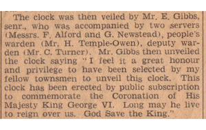 Then we have a newspaper cutting with 1935 written in biro at the top. This article names the occasion as commemorating the coronation of King George VI in May 1937 and goes on to describe the rest of the day’s events, a carnival parade, prizes awarded for fancy dress, a whist drive and a dance in the evening. Sports events had to be postponed due to a downpour.