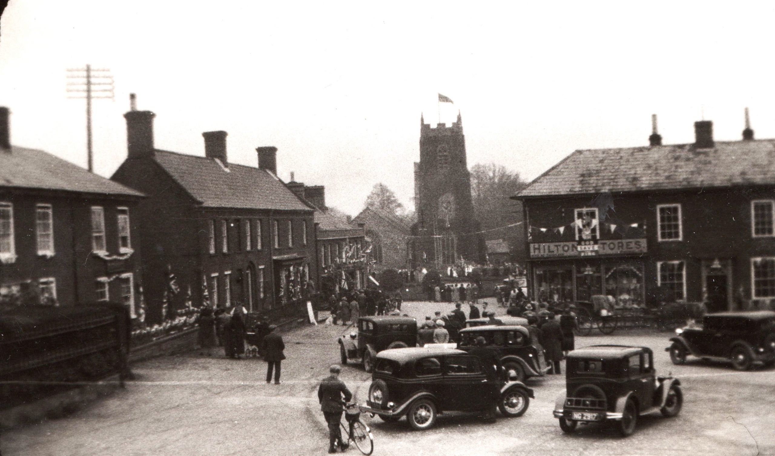 Flags are decorating the buildings and “God Save the King” can be seen on Hilton’s shopfront. White surplices of the choir show up at the base of the tower, and a long ladder has been placed against the tower wall.