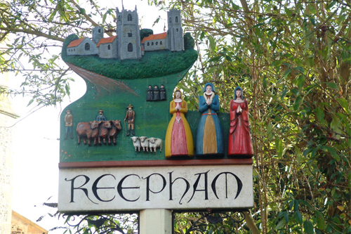 Below: Designed by students from Reepham High School, the town sign was installed in June 1992. It shows a group of three churches, villagers, farm labourers, sheep, lambs and “sisters” and refers to the story that three sisters were responsible for building a church each. Photo: Reepham Archive